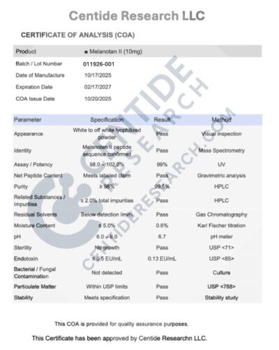 Every vial we sell comes from a lab that follows current Good Manufacturing Practices (cGMP). That means each step of production is documented and controlled. Before a batch is released, it’s tested by independent third-party labs for purity, identity, and sterility. Certificates of analysis are available so you can see the exact test results.