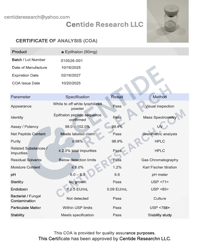 CAS Number: 307297-39-8 Description: Epithalon (also known as Epitalon) is a synthetic tetra-peptide derived from a naturally occurring compound produced by the pineal gland. It is studied for its potential effects on telomerase activation, cellular longevity, and regulation of the circadian rhythm. Research explores its role in age-related biology, oxidative stress resistance, and mitochondrial support. Disclaimer: This product is for laboratory research use only. It is not intended for human or animal consumption or for use in any diagnostic, therapeutic, or clinical applications.